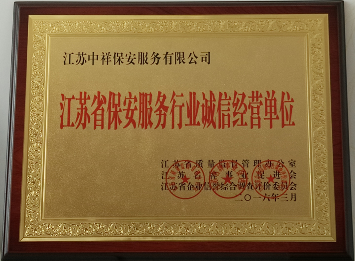 江蘇中祥保安公司榮獲江蘇省保安服務行業誠信經營單位